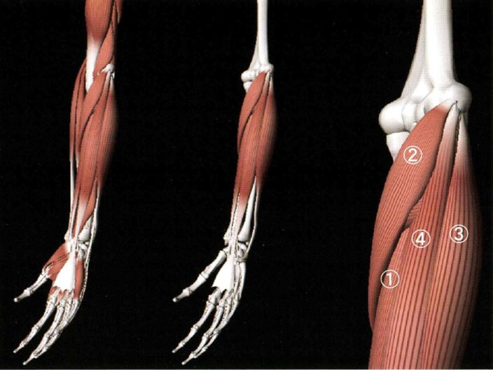 図:上腕骨内側上顆とそこに付着する手首を曲げる筋肉(前腕屈筋群①橈側手根屈筋、②円回内筋、③尺側手根屈筋、④長掌筋)