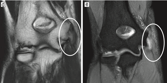 腱の断裂の程度や炎症の状態を詳細に評価できますが、必須の検査ではありませんが、T2強調像で高輝度領域を認めることがあり、鑑別疾患である尺側側副靱帯損傷、骨軟骨損傷との鑑別に有効です。