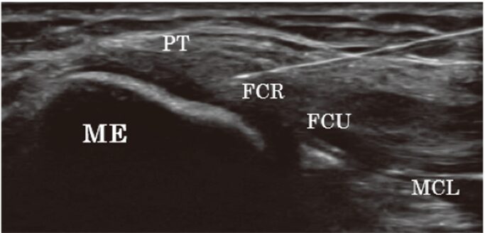 図:内側上顆に向かって、エコー下で注射針が施入される様子