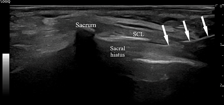 図:エコー下での仙骨硬膜外ブロック(白矢印は注射針)