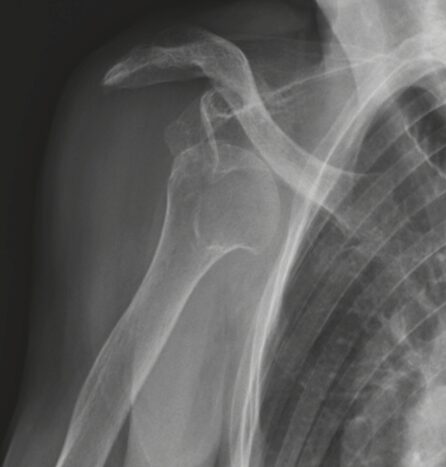 図:損傷した肩では前方の防波堤がなくなり、骨頭が外れかかっている