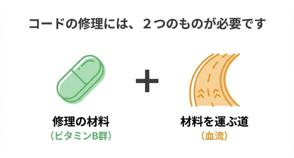 実は、神経が傷ついているとき、その修復に大量の「材料(ビタミンB群)」と、それを届ける「血流」が必要不可欠なのです。